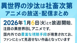 2026年1月より放送が開始される注目のアニメ『異世界の沙汰は社畜次第』。社畜男子が異世界で奮闘するというユニークな設定が話題を呼び、放送前から多くのアニメファンが配信を待ち望んでいます。本記事では、『異世界の沙汰は社畜次第』がどの動画配信...